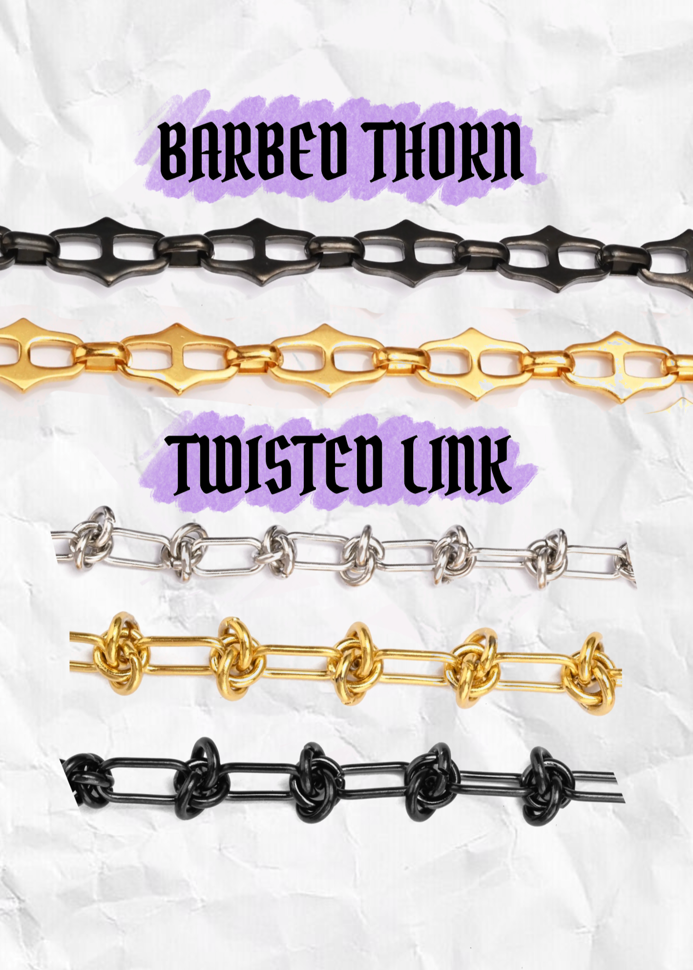 HEAVY CURB CHAIN ( 10 MM ), DELICATE CURB CHAIN ( 5 MM ), BARBED THORN CHAIN ( 4 MM), TWISTED LINKS ( 3 MM )