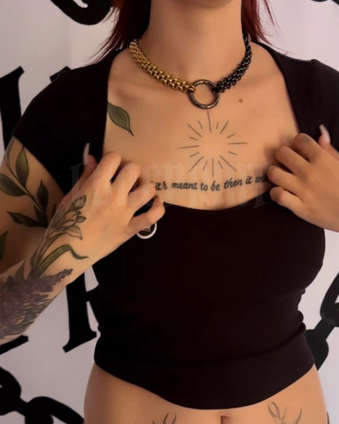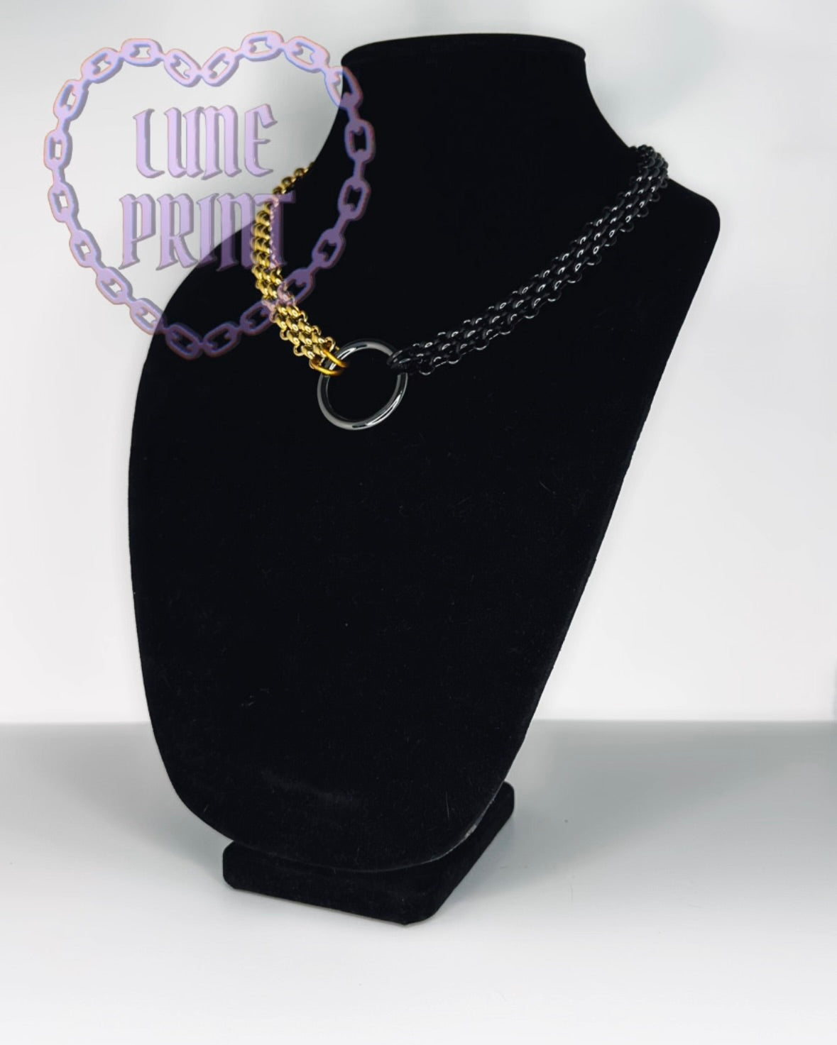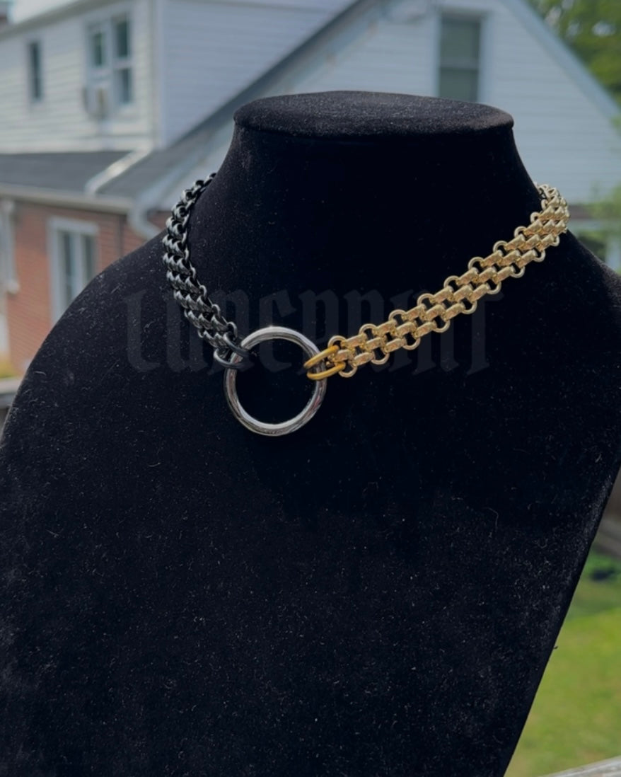 The necklace is 17” long made using a stainless steel chain and connected in the back with a large trigger hook clasp (see loop chokers for images of the clasp. The center piece hardware is made from zinc alloy and should be kept dry or sprayed with an acrylic varnish if you plan to wear the bubble chokers daily.
