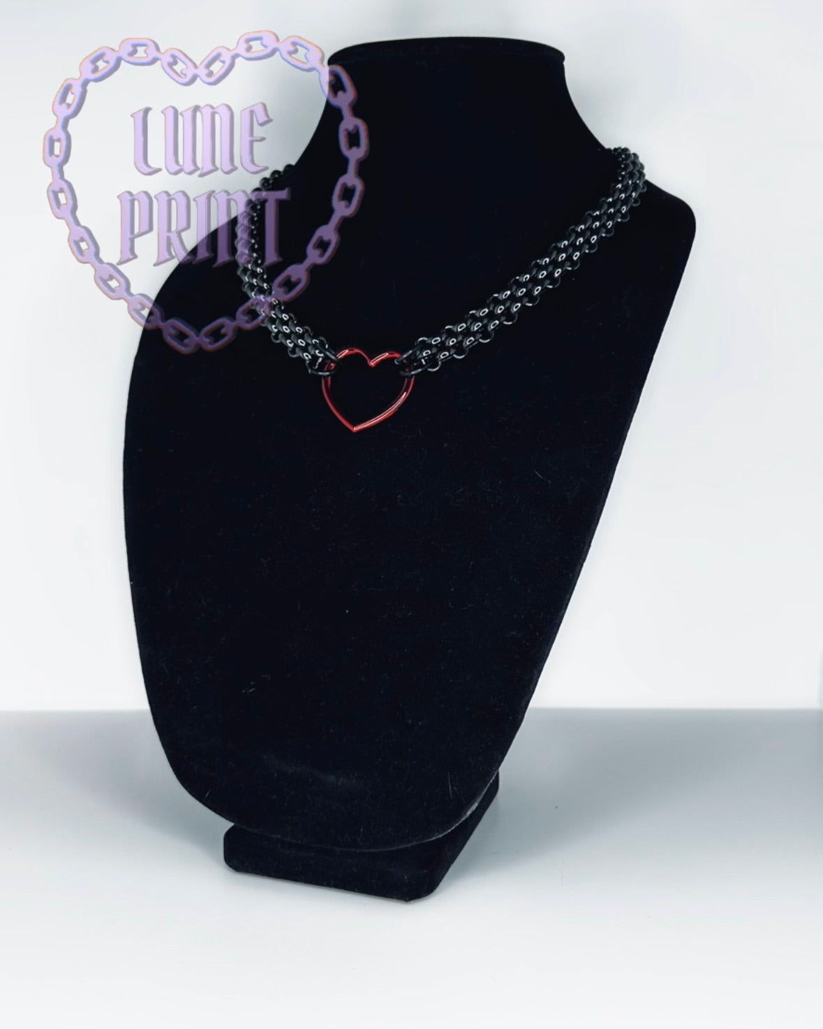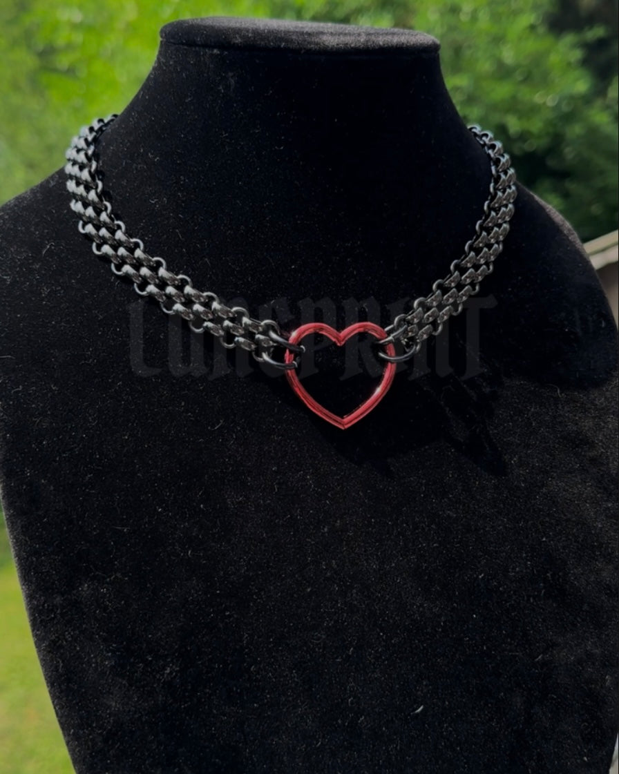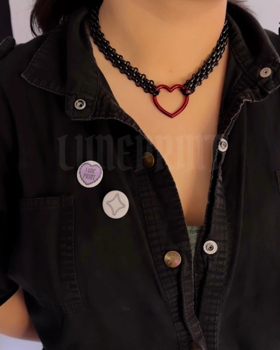 The necklace is 20” long made using a stainless steel chain and connected in the back with a 15 MM lobster claw clasp. The center piece hardware is made from zinc alloy and should be kept dry or sprayed with an acrylic varnish if you plan to wear the bubble chokers daily.