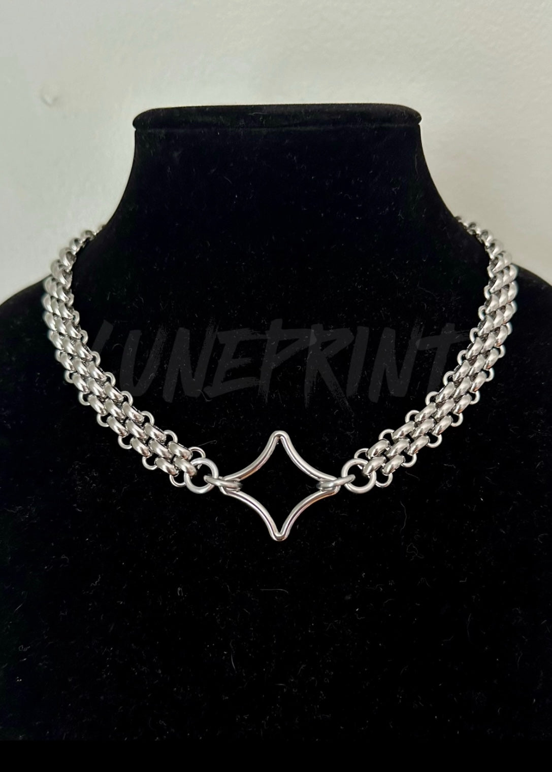 The necklace is 20” long made using a stainless steel chain and connected in the back with a 15 MM lobster claw clasp. The center piece hardware is made from zinc alloy and should be kept dry or sprayed with an acrylic varnish if you plan to wear the bubble chokers daily.